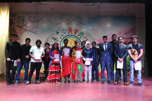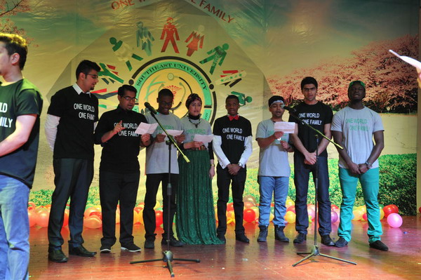 4月25日的颁奖晚会更是将这两周的激情氛围推向了高潮,海外教育学院、国际合作处、必威·BETWAY老师、各国留学生及中国学生,大家欢聚在此,共度良宵。现场激情四射,场面火爆。各国舞蹈轮番上阵,争奇斗艳,竟显英雄本色;各色穿着民族服装的伙伴们,每每上台都让人惊艳不已。印度吉他二重奏、阿拉伯歌曲,这种异域风情的曲调,更是别有一番滋味在心头。还有Farrukh等表演的喜剧,那种夸张搞笑的表演令人忍俊不禁。更让人激动和难忘的是留学生们自己翻译的东大校歌,以及09级学生自行设计的印有I LOVE SEU 的Tshirt, 自导自演的TV和歌曲,让全场掀起陷入对东大的无限热爱,那种学校的自豪感和光荣感一直膨胀……。