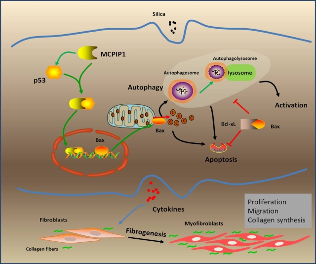 我们巢杰教授的论文“Macrophage-derived MCPIP1 mediates silica-induced pulmonary fibrosis via autophagy”于2016年10月25日被著名期刊Particle and Fibre Toxicology发表。该期刊是毒理学研究领域排名第一的国际权威刊物(5年影响因子为9.62)。本研究探讨了MCPIP1调控巨噬细胞自噬在矽肺纤维化中的功能。矽肺是由于长期吸入游离晶体二氧化硅粉尘引起的肺纤维化疾病,一旦发生,呈进行性发展。在矽肺发展过程中,纤维组织的过度修复造成肺组织结构紊乱,从而取代正常肺组织结构;实质为肺泡损伤、胶原沉积,最终导致肺纤维化。目前矽尘引起肺纤维化的具体机制还不清楚,但作为与矽尘接触的第一道防线的肺泡巨噬细胞被认为在矽肺的发生发展中起着重要的作用。MCPIP1是一种锌指蛋白,作为炎性因子MCP-1重要的下游分子,在成纤维细胞的增殖和迁移中发挥着重要作用。本研究发现在单核细胞诱导的巨噬细胞中,MCPIP1能够通过结合p53蛋白,诱导细胞自噬反应的发生;过度的自噬引起了巨噬细胞的活化和凋亡,从而促进纤维化因子如MCP-1、TNF-α和TGF-β的分泌。有趣的是,在SiO2处理下,MCPIP1诱导的自噬促进人肺成纤维细胞的增殖和迁移。该研究证实MCPIP1介导的自噬在SiO2诱导的肺纤维中发挥着至关重要的作用。