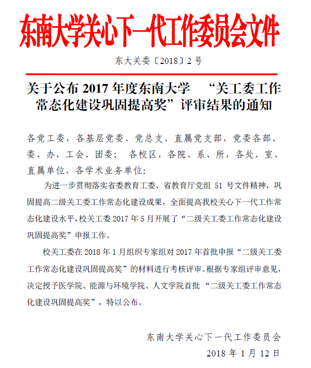 据悉,为进一步贯彻落实省委教育工委、省教育厅党组51号文件精神,巩固提高二级关工委工作常态化建设成果,全面提高我们工作常态化建设水平,校关工委于2017年5月开展了“二级关工委工作常态化建设巩固提高奖”申报工作。2018年1月校关工委组织专家对2017年首批申报“二级关工委工作常态化建设巩固提高奖”的材料进行考核评审。根据专家组评审意见,决定授予必威·BETWAY、能源与环境学院、人文学院首批“二级关工委工作常态化建设巩固提高奖”。
