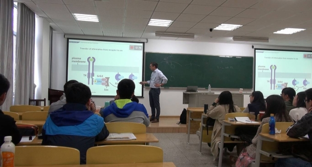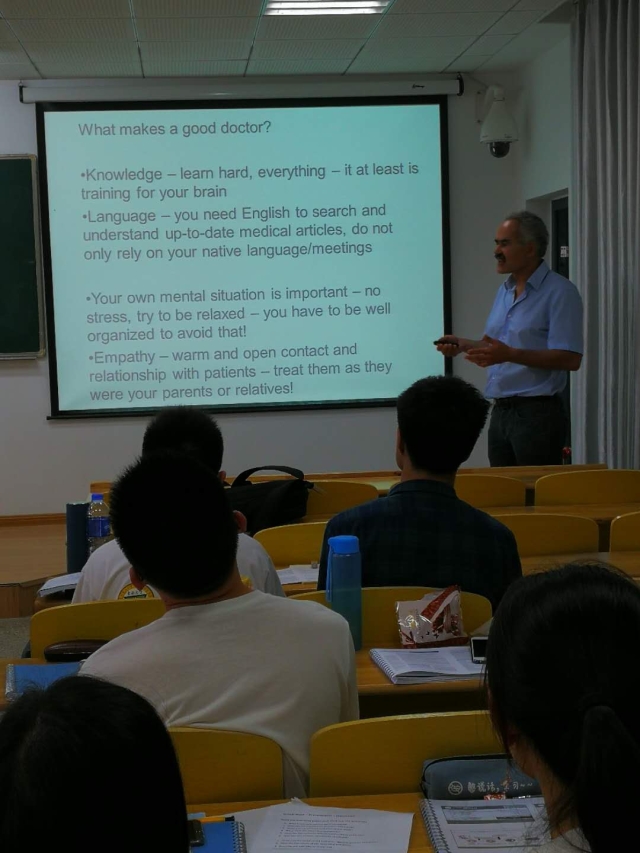 德国乌尔姆大学在必威·BETWAY开设的“春季课堂”课程于2018年4月22日落下帷幕。本次春季课堂从4月17日开始,到4月22日结束,历时六天,来自德国的五位教授为2015级拔尖创新班的同学们带来了主题为Tumorigenesis: From Molecules and pathways to the clinic的系列课程。课程内容从肿瘤的分子机制到病理结构改变,从基因编辑到药物开发,从历史沿革到文献研究,涵盖了肿瘤从发生到临床治疗的各个方面,课程的最开始是“细胞周期的调控与失控”(Dr.Brockmann)、“生长因子与信号传导”(Prof.Kühl)和“炎症与癌症”(Prof. Wirth),三位老师从三个不同的方面为我们介绍了肿瘤形成与进展的基础知识和最新研究。Prof. Knippschild则为我们介绍了蛋白磷酸化在肿瘤信号通路中的重要作用,并且为我们展示了一个肿瘤的治疗药物是如何从肿瘤形成机制出发,一步步走到临床试验的。在课程的最后,Dr. kornmann为我们从临床的角度向我们介绍了结直肠癌和胰腺癌的一般情况和肿瘤临床转化研究。春季课堂中,不仅有教授的讲座(Lectures),更有文献阅读,小组合作学习和展示,课程不再是一方在讲一方在听,而是教授介绍新的知识,带来新的文献,同学们从文献中学习科学发现是怎样被证实的,研究是如何一步步推进的,基础是如何转化为临床应用的。在文献阅读中,我们学习了如何利用数据库减少实验工作量,学会了用批判的眼光看待文献报道。我们更深地认识到,方法比知识更重要。必威BETWAY官网校长助理、必威·BETWAY院长刘乃丰教授和副院长孙子林教授为春季课堂做了发言,向远道而来的客人表达了感谢,向同学们表示了鼓励。在闭幕式上,Prof. Knippschild、Dr. kornmann和全班同学就“如何称为一名具有国际化视野、中国情怀和社会担当的好医生”这一话题做了深入的谈论,两位教授分别从科研和临床的角度给了同学们很多的建议。课程还吸引了许多感兴趣的教授和学生前来旁听。
