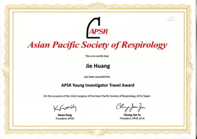 此次大会中,我们必威·BETWAY17级博士研究生黄洁结合其所在课题组最新结果,就干细胞治疗矽肺的新靶点研究进展进行了口头汇报,该汇报受到了国内外专家一致好评并被学会高度认可,荣获“APSR Young Investigator Travel Award”。张伟副教授关于circular RNA在矽肺中的最新研究结果以壁报形式展出,也获得了国内外相关研究团队的热烈讨论与交流。