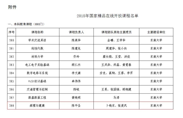 近日,教育部发布《教育部关于公布2018年国家精品在线开放课程认定结果的通知》,我们病理学与病理生理学系团队开设的《病理与健康》荣获“国家精品在线开放课程”认定。这是我们首次荣获该项认定,也是目前教育部认定的江苏省首门、国内第二门病理学科精品在线开放课程,继2016年我们《病理学》被认定为首批国家网络教育精品资源共享课程以来,课程建设再上新台阶。