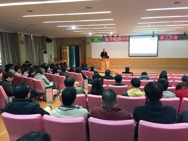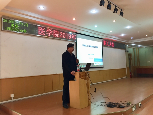 刘院长和谭书记鼓励大家以习近平新时代中国特色社会主义思想为指导,认真贯彻党的十九大精神和全国教育大会精神,牢记立德树人使命,明确医学教育的新使命、新要求,按照大学综合改革方案、一流本科教育行动计划和研究生教育综合改革方案,推进特色医科建设,聚焦双一流建设,全面提升人才培养质量,大力加强人才师资队伍建设,努力实现内涵式发展,全面实现2019年的工作目标。