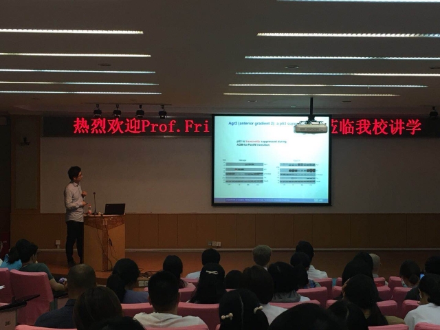 此次讲座Friess教授讲述了关于大肠癌肝转移中肝切除术的相关进展,全面介绍了大肠癌肝转移患者治疗的跨学科合作模式,为在场的医学生提供了更好的临床问题解决思路。孔波博士的讲座课题是关于胰腺癌早期癌变的分子模型,从生物化学与分子生物学的角度分析了建立胰腺癌早期癌变的小鼠模型的相关理论,为学生基础研究提供了更清晰的研究思路与更值得借鉴的研究角度。此次会议得到了研究生院等各方的指导和支持,吸引了很多在校学生,为学生们之后的科研及临床研究及学习提供了宝贵的经验及学习资料。在两位嘉宾与学生热烈交流互动之后,本次讲座圆满结束。(高洁)