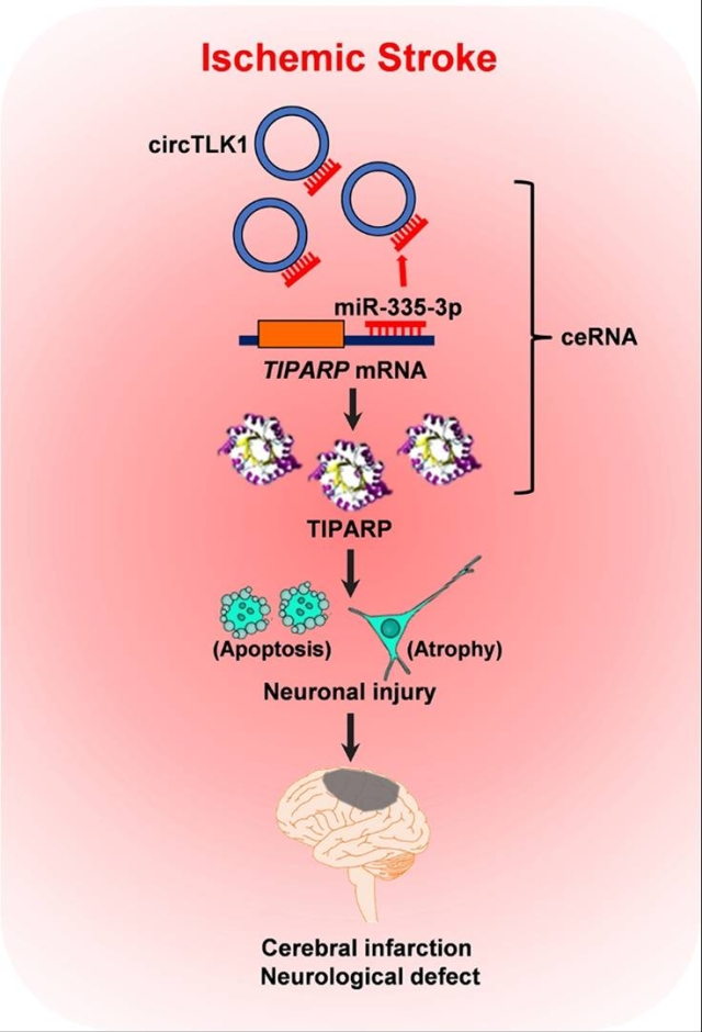 缺血性脑卒中,又称“脑梗塞”或“脑栓塞”,具有“发病率高、致残率高、死亡率高、并发症多”的特点。脑卒中已成为我国第一位死亡原因。缺血性脑损伤涉及复杂的病理生理过程,脑缺血后神经元损伤的程度是决定脑卒中结局的主要因素,然而,控制缺血神经元死亡的分子开关却鲜为人知,因此,研究脑缺血后的神经元损伤及其分子调控机制具有重要意义。该项工作深入系统地探讨了环状RNA TLK1(circTLK1)及其通路在脑缺血后神经元损伤中的机制以及潜在生物学标记的价值。该研究发现circTLK1表达水平在局灶性脑缺血再灌注小鼠脑组织中显著升高。敲低circTLK1可显著降低脑梗死体积,减轻神经元损伤,改善神经功能缺损。进一步分子机制研究阐明,上调的circTLK1以sponge方式竞争性结合miR-335-3p而上调下游靶蛋白TIPARP的表达,从而导致神经元损伤并加重脑梗死和神经功能缺损。临床研究也证实急性缺血性卒中患者血浆中circTLK1水平升高。该研究不仅揭示了脑缺血中神经元损伤的一个新机制,而且为改善脑卒中后神经损伤的提供潜在的干预策略。
