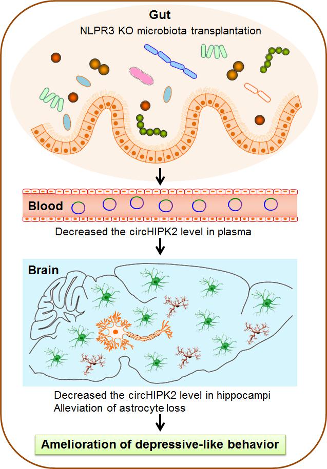 抑郁症是一种情感障碍性疾病,由社会、环境和个体三方面因素相互作用引起。具有高发病率,高复发率,高致残率和高自杀率等特点,位居全球疾病总负担第二位。姚红红教授课题组发现NLRP3基因敲除小鼠其野生型同窝小鼠相比表现出显着的行为差异,并且其肠道微生物群的组成显着改变,提示这种行为的差异很有可能是肠道菌群的变化引起的。随后,为了确定肠道微生物在其中发挥的作用,该课题组进行了NLRP3基因敲除小鼠的肠道微生物群的移植,随机发现肠道微生物移植可以避免了敲除NLRP3基因引起的自发活动增加,同时也改善了慢性不可预测应激诱导的小鼠抑郁样行为。课题组进一步发现移植肠道菌群可以通过抑制环状RNA-HIPK2在脑内的表达,调节慢性不可预测应激诱导的脑内星形胶质细胞功能障碍,从而显着改善小鼠的抑郁样症状。