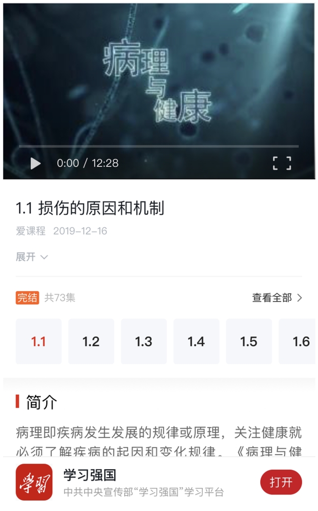 我们开设的慕课《病理与健康》(国家精品)于2019年12月16日被“学习强国”APP选用,上线两周仅第一讲点赞量超1.7万。