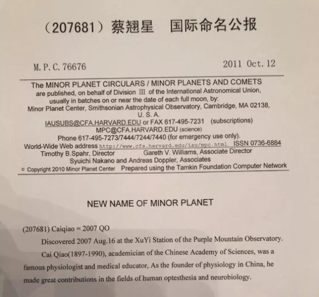 蔡翘一生艰苦创业、涉猎广泛,在生理学领域进行了多方面的开创性工作,取得了众多重要的发现和成就。他是我国杰出的医学教育家,生理科学界的奠基人和开拓者,航天、航空、航海医学的创始人。2011年10月14日,在北京隆重举行了国际编号207681小行星为“蔡翘星”命名仪式(图8)。蔡翘一生建立的卓越功勋将永远伴随着这颗星星闪耀在茫茫宇宙。
