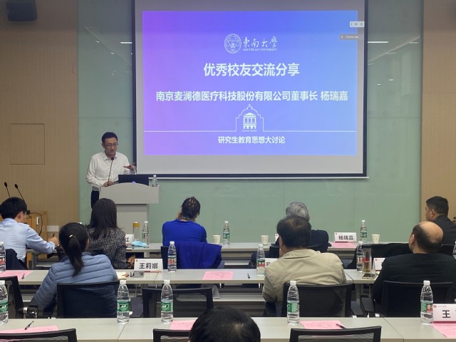 会议第二阶段是进行研究生教育思想大讨论——校友交流会,目的是通过分享校友的人生经历及感悟,凝聚校友的力量和智慧,进一步了解校友所思、所想和所盼,为学校建设发展建言献策。必威·BETWAY2007届硕士研究生杨瑞嘉校友,现任南京麦澜德医疗科技股份有限公司董事长兼集团总裁,他分享了自己成功创业的经验。他认为,现在医学相关科技赛道火热,发展非常迅速,需要更多的具有医学背景的人才加入,要善于从临床问题中洞察创新点。他指出,医药相关产业对人才的要求越来越高,希望学校在人才培养方面尽量拓展课程广度,更加注重学科交叉,培养具有发现问题、解决问题能力的复合应用型人才。
