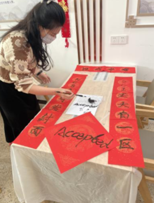 活动现场,同学们认真书写饱含对新春及未来生活美好期盼的各式春联。