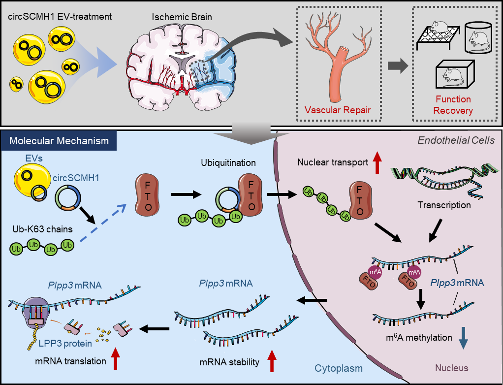研究团队首先发现,EV-circSCMH1能够有效促进缺血性卒中模型小鼠与恒河猕猴脑血管修复,并且显著降低卒中模型小鼠脑部N6-甲基腺苷(N6-methyladenosine,m6A)修饰(一种在真核生物mRNA常见的修饰方式)修饰。进一步机制研究表明,circSCMH1促进脑血管内皮细胞FTO发生泛素化修饰,增加FTO向核内转移,导致血管发育相关基因-脂质磷酸磷酸酶3(lipid phosphate phosphatase 3,Plpp3)的m6A修饰降低,从而抑制了YTHDF2对Plpp3 mRNA的降解,导致Plpp3 mRNA与其编码蛋白LPP3在内皮细胞中的水平增加,促进血管修复。