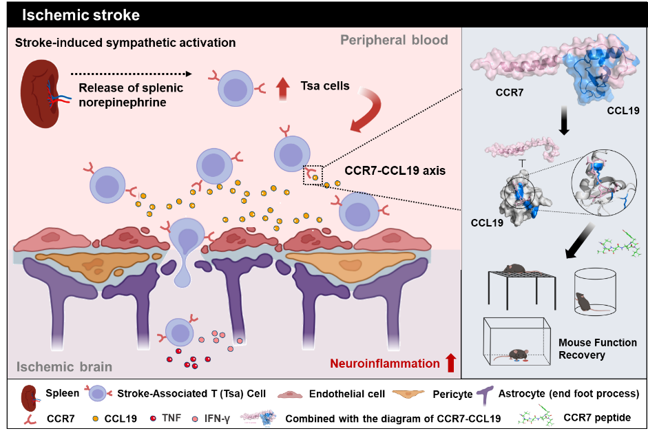 该研究通过单细胞RNA测序,在急性缺血性卒中(AIS)患者中发现并鉴定了新的致病性CD8+GZMK+CD27+CCR7+T细胞亚群,将其命名为卒中相关T细胞(Tsa)。研究发现,Tsa细胞的扩增与患者临床症状严重程度呈正相关,其动员受脾交感神经系统驱动:卒中诱发的交感神经激活导致脾脏释放去甲肾上腺素(NE),NE通过β2-肾上腺素能受体(ADRB2)信号通路,促进Tsa细胞活化与释放。进一步机制研究表明,脑缺血损伤会诱导内皮细胞特异性表达趋化因子CCL19CCL19通过与其同源受体CCR7结合,将Tsa细胞趋化募集至脑实质,从而加剧神经炎症损伤和神经功能缺损(在短暂性大脑中动脉闭塞tMCAO小鼠模型中得到验证)。研究人员开发了一种靶向CCR7的肽抑制剂,成功阻断了CCL19-CCR7趋化轴,有效减少了Tsa细胞脑浸润导致的级联损伤。此外,研究团队采用脾交感神经去神经支配术(SDN)进行干预,显著减轻再灌注脑损伤。该研究解析了缺血性卒中后神经-免疫互作的新机制,并为再灌注脑损伤的治疗提供了潜在有效治疗方法。