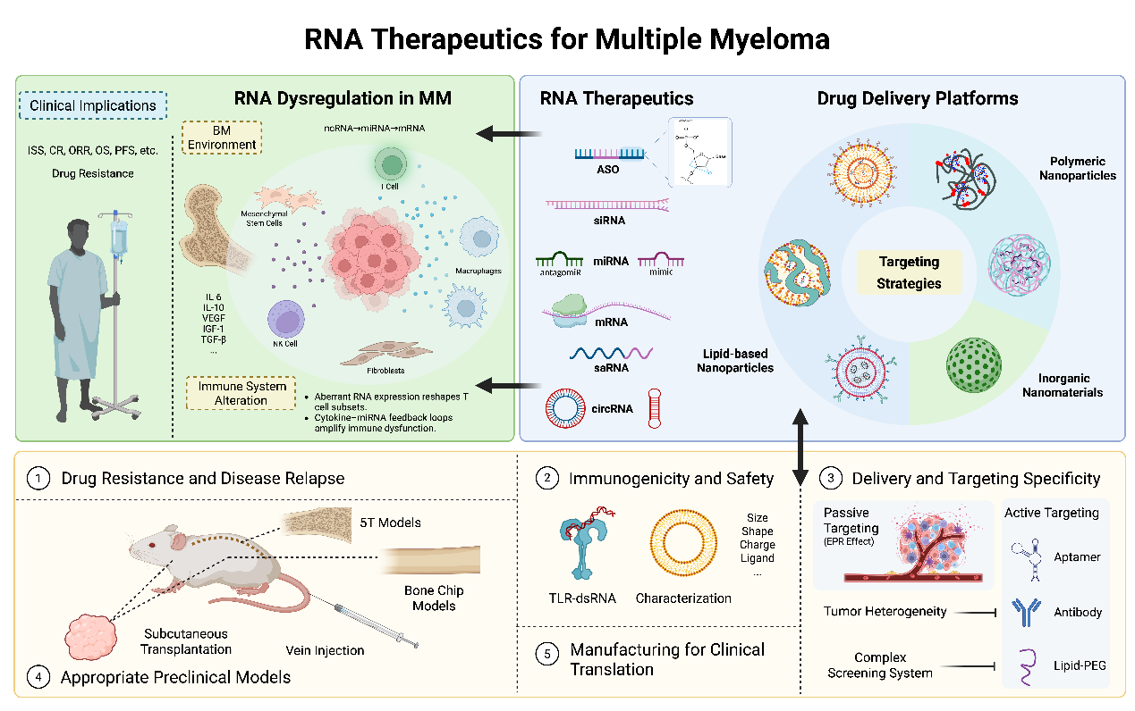 多发性骨髓瘤(Multiple Myeloma, MM)是一种慢性血液系统恶性肿瘤,因大多数患者用药后会复发或对多种治疗手段产生耐药性导致其至今仍无法被完全治愈。尽管目前已开发出多种新型治疗策略(包括靶向小分子药物、抗体药物与细胞疗法),但由于MM细胞在演化过程中表现出高度异质性并驱动耐药机制,极大地限制了现有临床治疗的疗效。近年来,RNA疗法在癌症治疗领域展现出巨大潜力。通过特异性地抑制或上调特定靶点序列,RNA疗法有望成为治疗MM的重要手段,并可与其他药物联合使用显著提高MM细胞对药物治疗的敏感性。然而,目前针对MM的有效核酸靶点以及理想的RNA药物递送技术尚不明确。本文总结了MM临床治疗中所面临的主要挑战,重点阐述了靶向MM细胞中异常表达的RNA分子所带来的治疗优势。通过总结潜在的分子靶点、递送系统及临床转化难点,本文进一步探讨了RNA疗法在MM治疗中的应用前景及其全球临床转化的可行性。