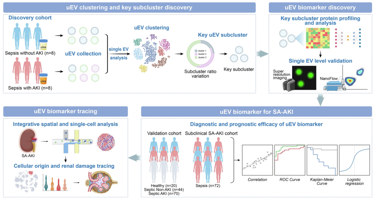 据悉,脓毒症引发的急性肾损伤因其高死亡率和高并发症风险,一直是临床救治的难点。传统诊断方法依赖于血清肌酐等滞后的功能性指标,无法实现早期识别和及时干预。尿液细胞外囊泡(urinary extracellular vesicles, uEVs)作为肾脏细胞释放的生物信息载体,具备无创损伤性标志物的潜力,然而其高度异质性和混杂来源长期阻碍了特异性生物标志物的发现。